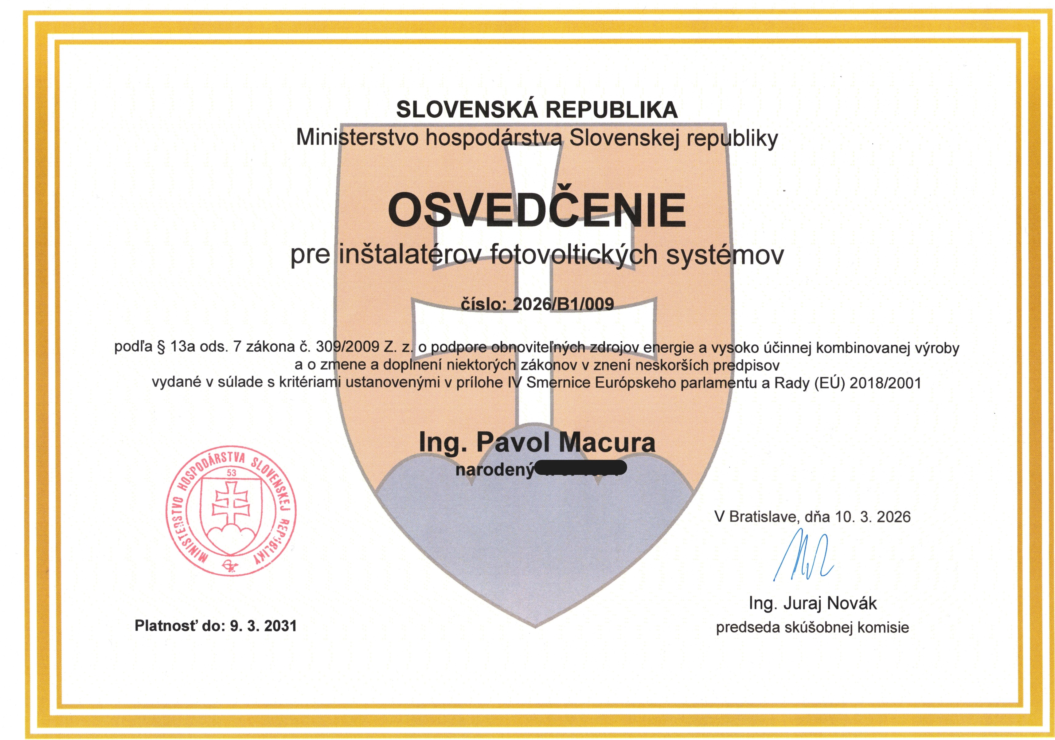 Disponujeme osvedčením pre inštaláciu fotovoltických systémov vydaným Ministerstvom hospodárstva Slovenskej republiky, ktoré potvrdzuje našu odbornú kvalifikáciu v oblasti návrhu a montáže zariadení využívajúcich obnoviteľné zdroje energie.